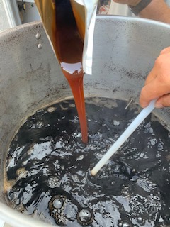 We started out by hanging a cheese cloth bag inside the brewing vessel and poured the ingredients into the bag and allowed it to soak. After soaking all of the ingredients for the required time we had to stir the ingredients.