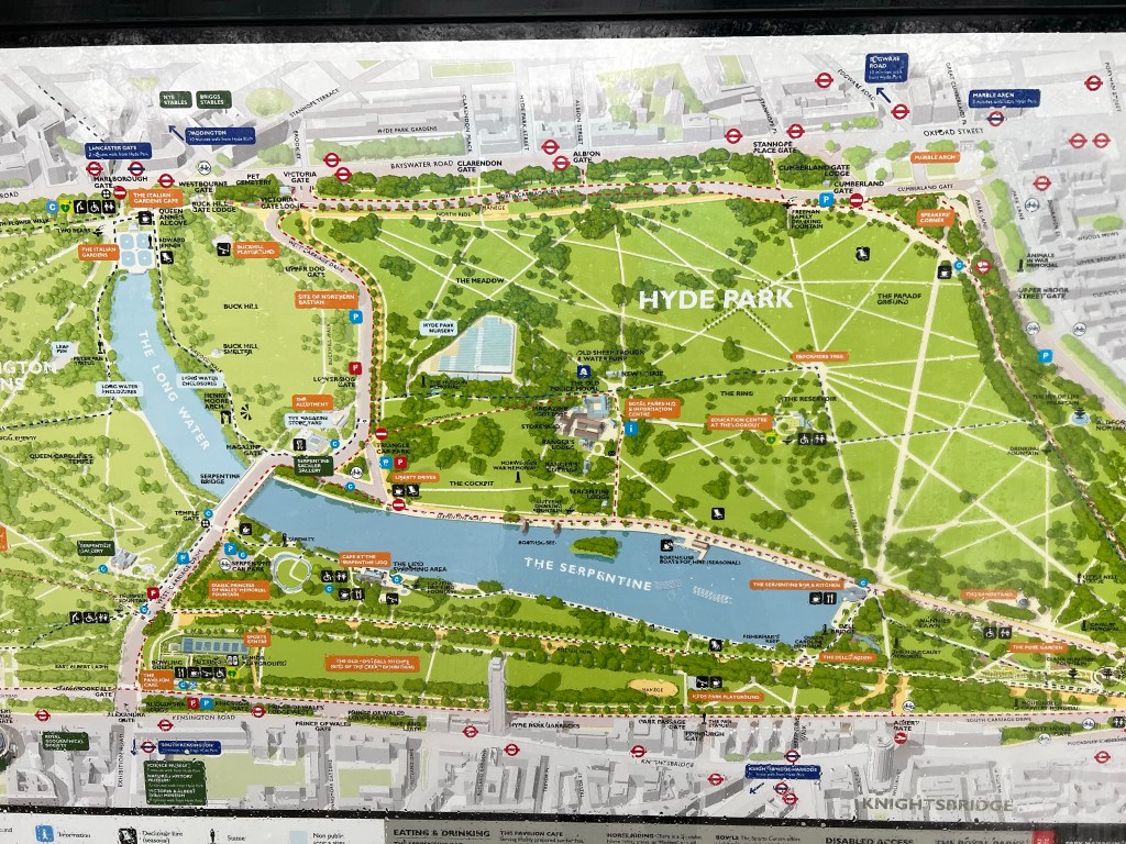 We were told that The Brass Rail in Selfridges is a great place for pastrami sandwiches, matzo ball soup, and latkes. I grew up on Canter’s in L.A. and am a big fan of Sarge’s and Katz’s in NYC (each for very different reasons) so the prospect of trying one of my favorite meals in London was thrilling. We were staying in Westminster, so Selfridges was about two miles from our hotel. We decided to walk and spend some time in Hyde park.